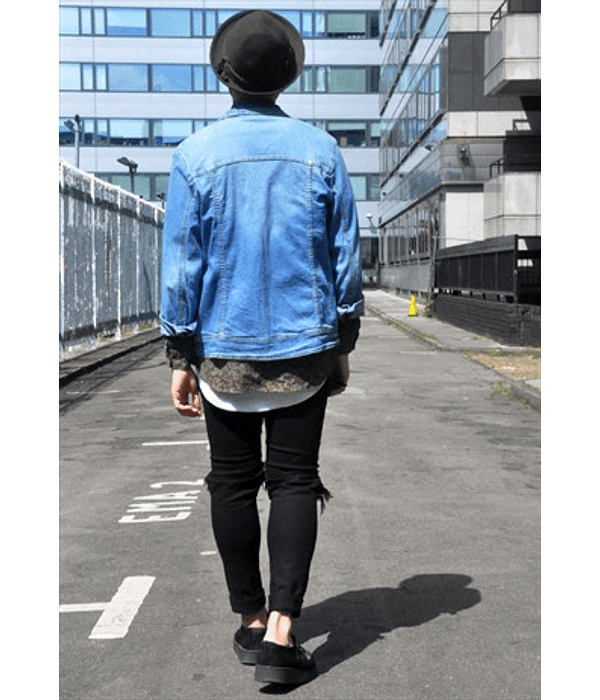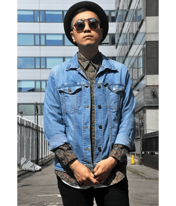 Lightweight, blue, shirt-style, denim cotton jacket. Orange stitching provides a colour contrast. Silver buttons, buttoned cuffs, flap covered breast pockets and wide collar. Classic street wear piece. The top button is missing, otherwise in good vintage condition. Label Size: Medium. Can be worn unisex. Please check your measurements with those listed here before buying to be sure it's the right fit for you. (Model Size: UK-M/5ft 8, Item Size: Armpit to Armpit - 53cm/20.5", Length - 68cm/26.5"). All items sent UK Royal Mail 'Signed For'.